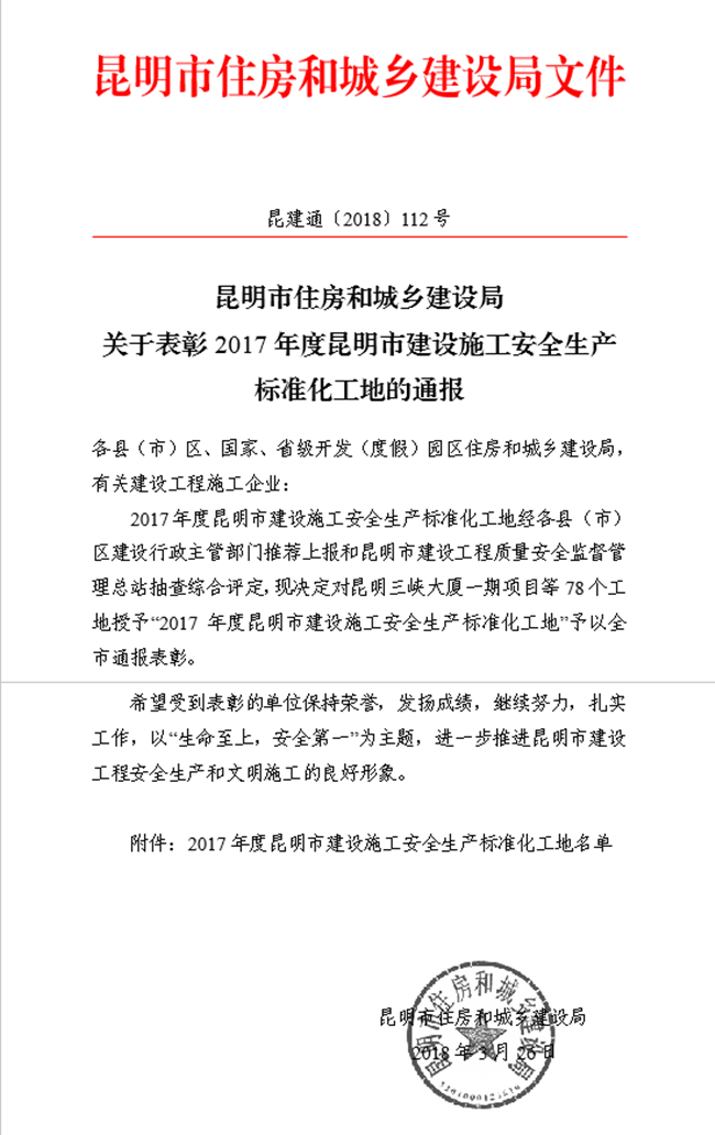 部分榮獲“昆明市建設(shè)施工安全生產(chǎn)標(biāo)準(zhǔn)化工地”的項(xiàng)目名單