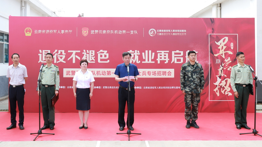 啟動(dòng)儀式上,云南省退役軍人廳就業(yè)創(chuàng)業(yè)處處長(zhǎng)金星華代表省退役軍人事務(wù)廳致辭,武警云南總隊(duì)機(jī)動(dòng)第一支隊(duì)政治委員盧文高作講話動(dòng)員并宣布招聘活動(dòng)開(kāi)始。云南省退役軍人廳軍供站站長(zhǎng)鄺云亮,武警云南總隊(duì)保障部裝備處副處長(zhǎng)曹銳,武警云南總隊(duì)機(jī)動(dòng)第一支隊(duì)支隊(duì)長(zhǎng)張定乾,能投居正公司副董事長(zhǎng)、省基地負(fù)責(zé)人杜紅英出席啟動(dòng)儀式。能投居正公司、能投物業(yè)公司、能投軍創(chuàng)公司、昆明經(jīng)濟(jì)技術(shù)開(kāi)發(fā)區(qū)安泰保安服務(wù)有限公司、融創(chuàng)物業(yè)服務(wù)集團(tuán)昆明分公司、云南順豐速運(yùn)有限公司等27家企業(yè)參加招聘會(huì)。